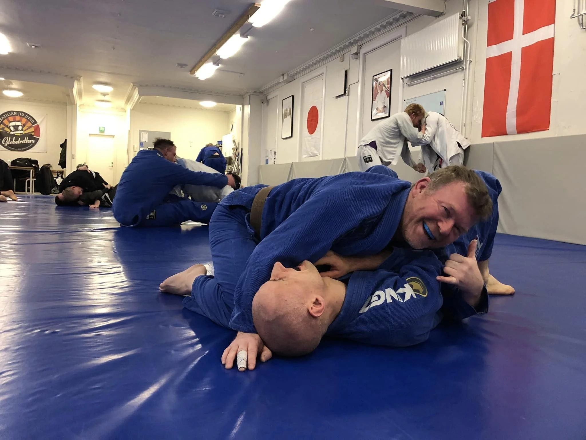 Claus (tv./øverst i blå gi) er brunbælte i jiu jitsu og har trænet kampkunst siden 1984. Han er også brunbælte i Shotokan Karate, og har derudover trænet Wing Tsun, Jeet kune Do samt MMA i flere år. Claus har i sin undervisning stort fokus på de små detaljer i teknikken, og på selve fundamentet i jiu jitsu. Han udvikler sig konstant ved at studere de seneste “trends” i jiu jitsu,